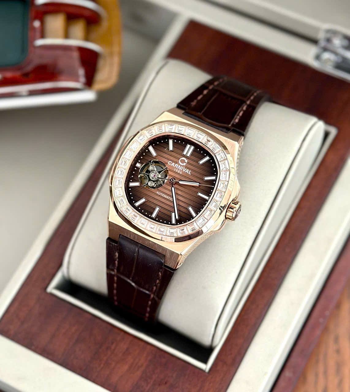 Đồng Hồ Nam Carnival 8128G-VH-DD-N Mặt Số Nâu Chocolate - Dây Da: Thiết Kế & Viền Đá Nói Lên Đẳng Cấp Của Bạn