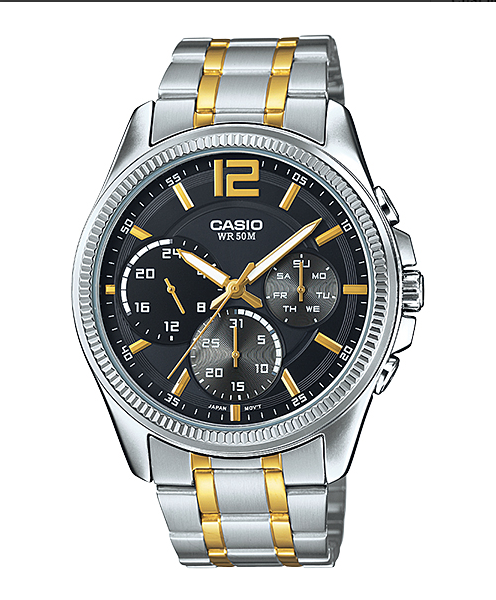 Đồng hồ Casio nam MTP-E305SG-1AVDF với mặt số bao gồm 3 mặt số phụ, kim và chỉ số giờ bằng vàng, và nhiều mặt số kết hợp màu kim loại trắng - đen - vàng đầy tinh tế!