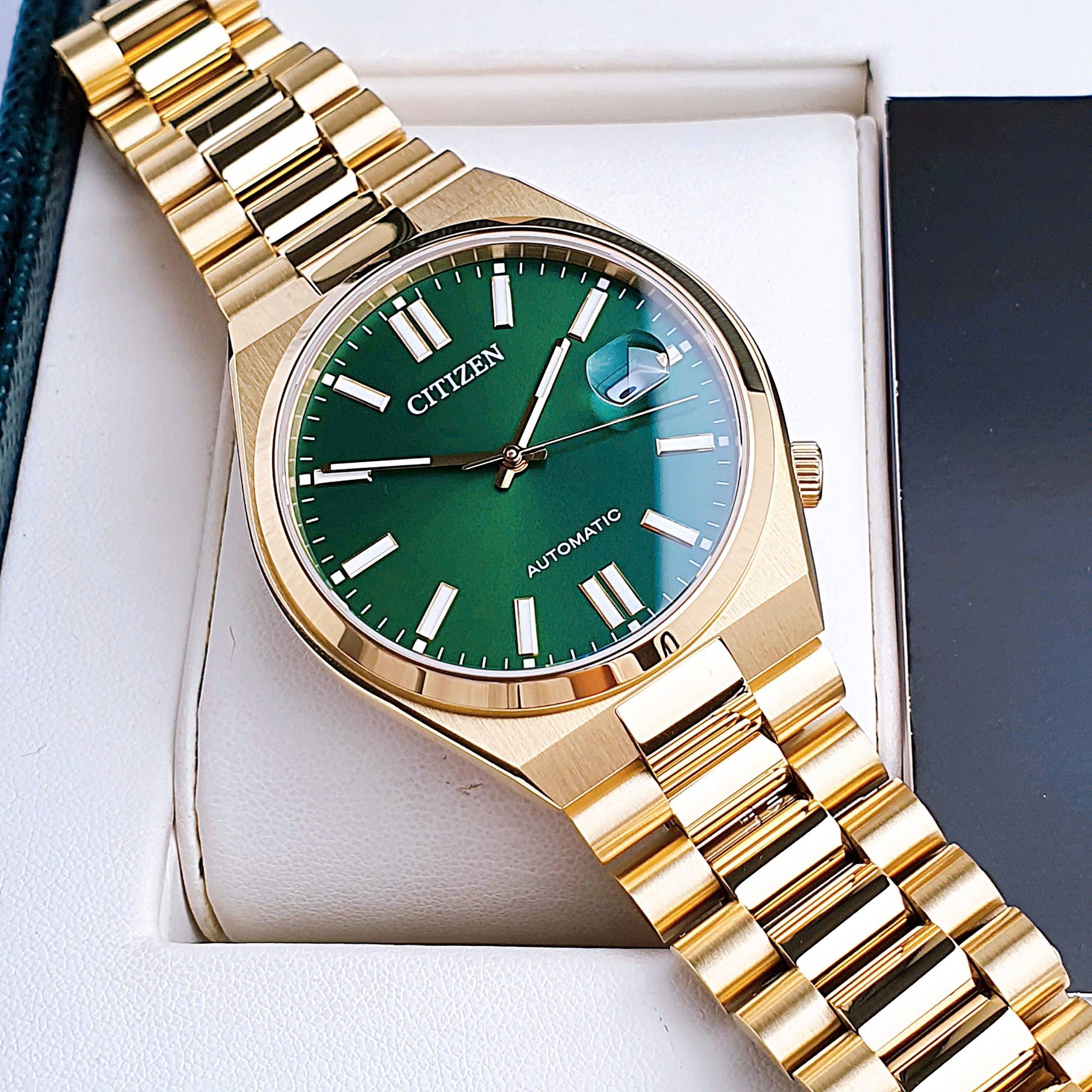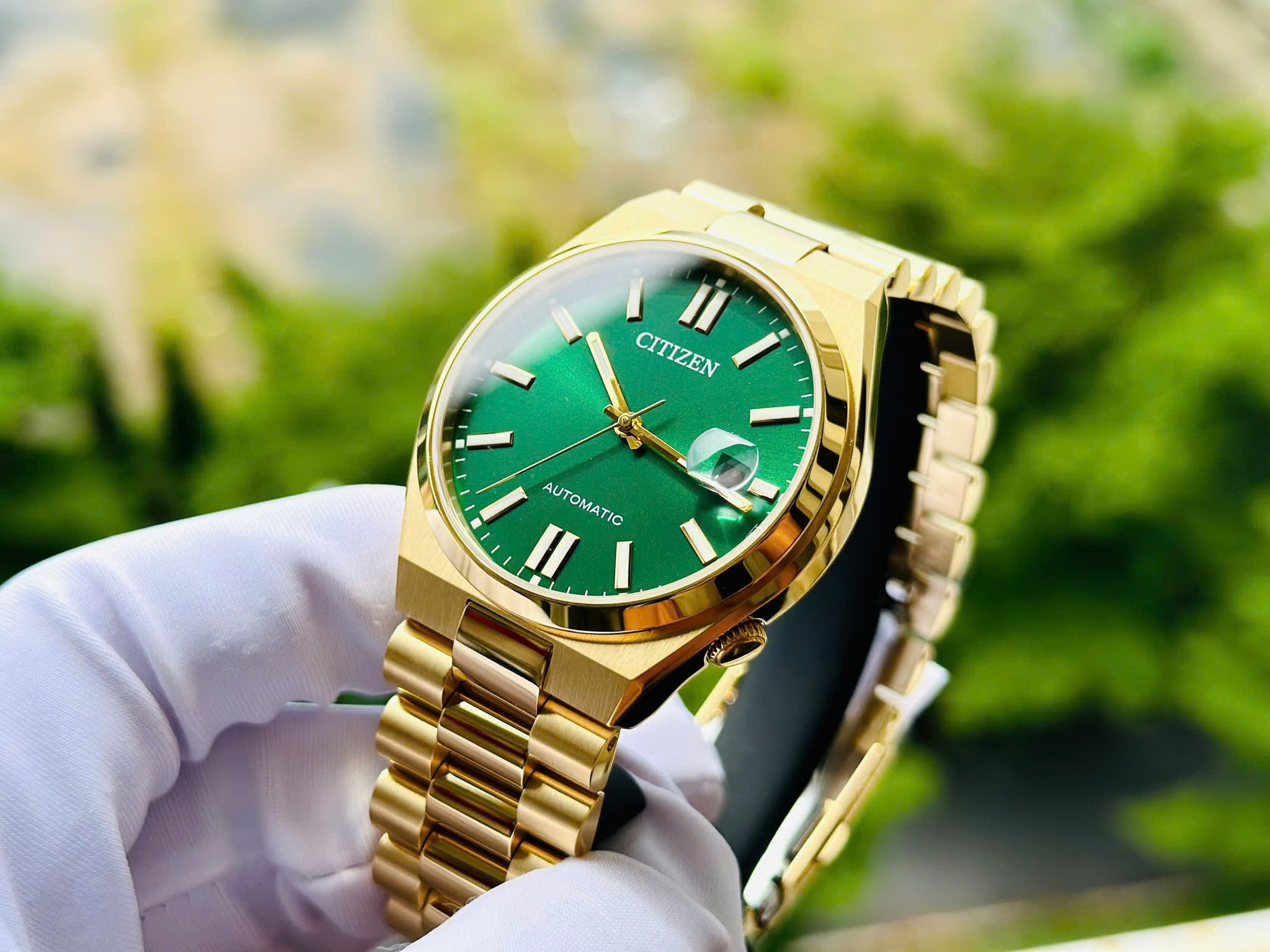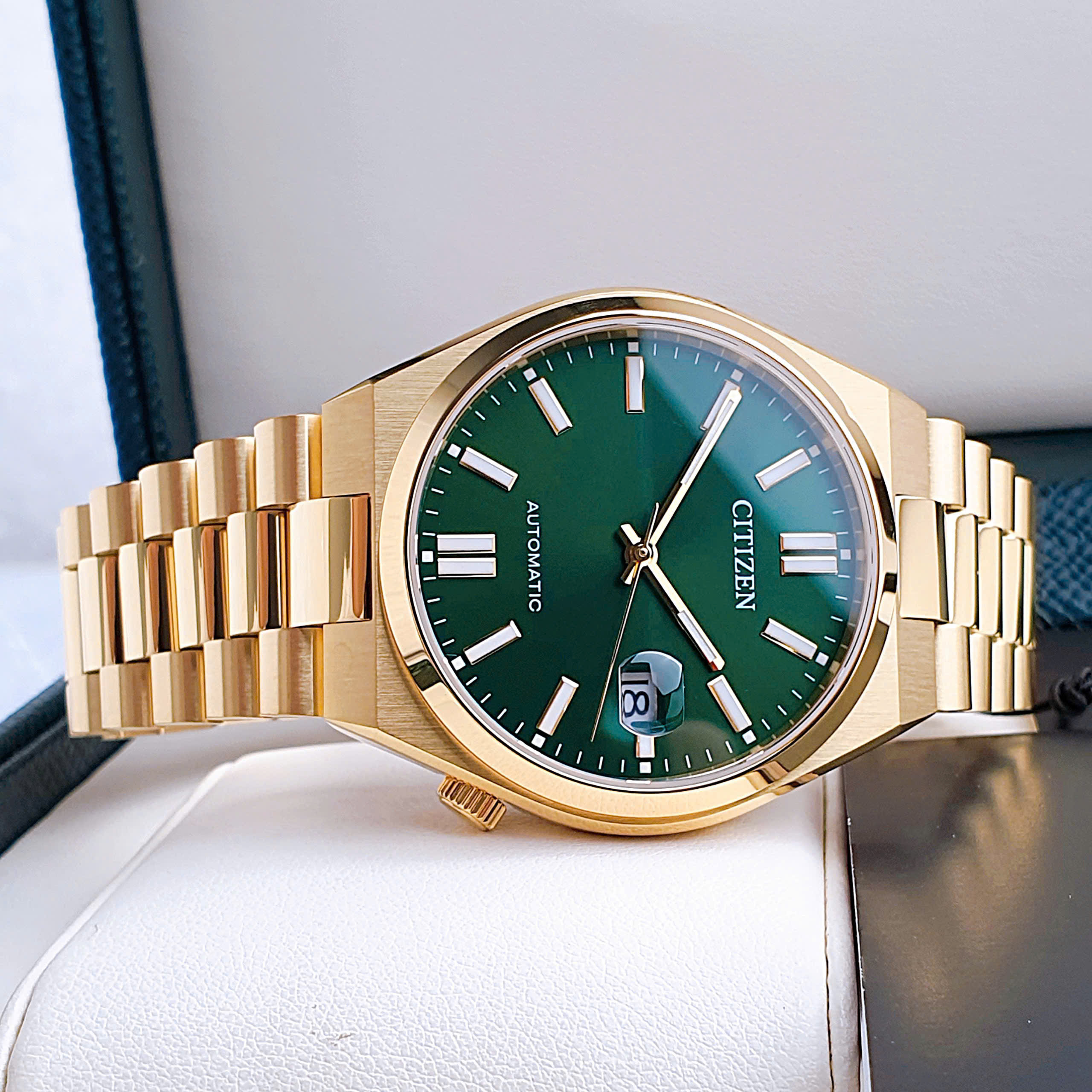 Đồng hồ Citizen Tsuyosa NJ0152-51X President - Dây Thép Full Vàng Gold & Mặt số Xanh Lá Sapphire là sự kết hợp tinh tế giữa vẻ đẹp cổ điển của đồng hồ cơ và phong cách hiện đại, lịch lãm cho các quý ông đam mê đồng hồ thời trang nam!