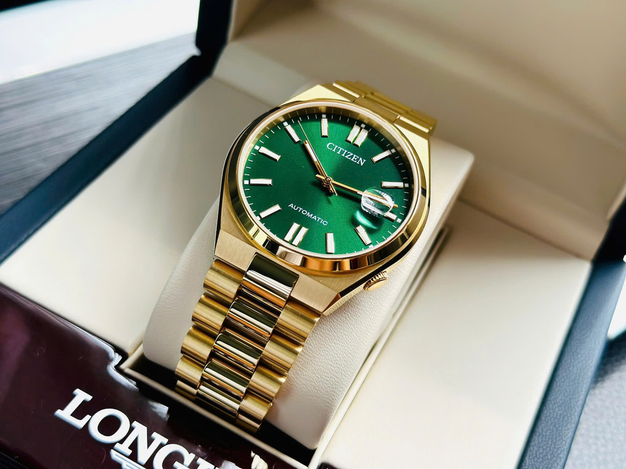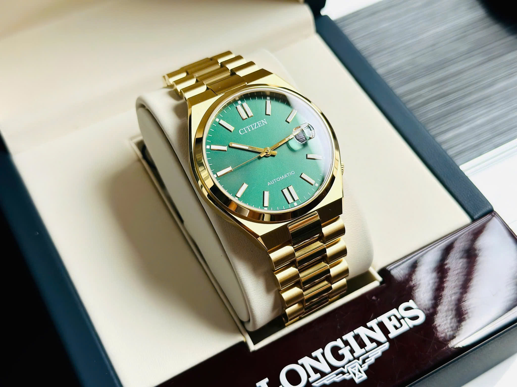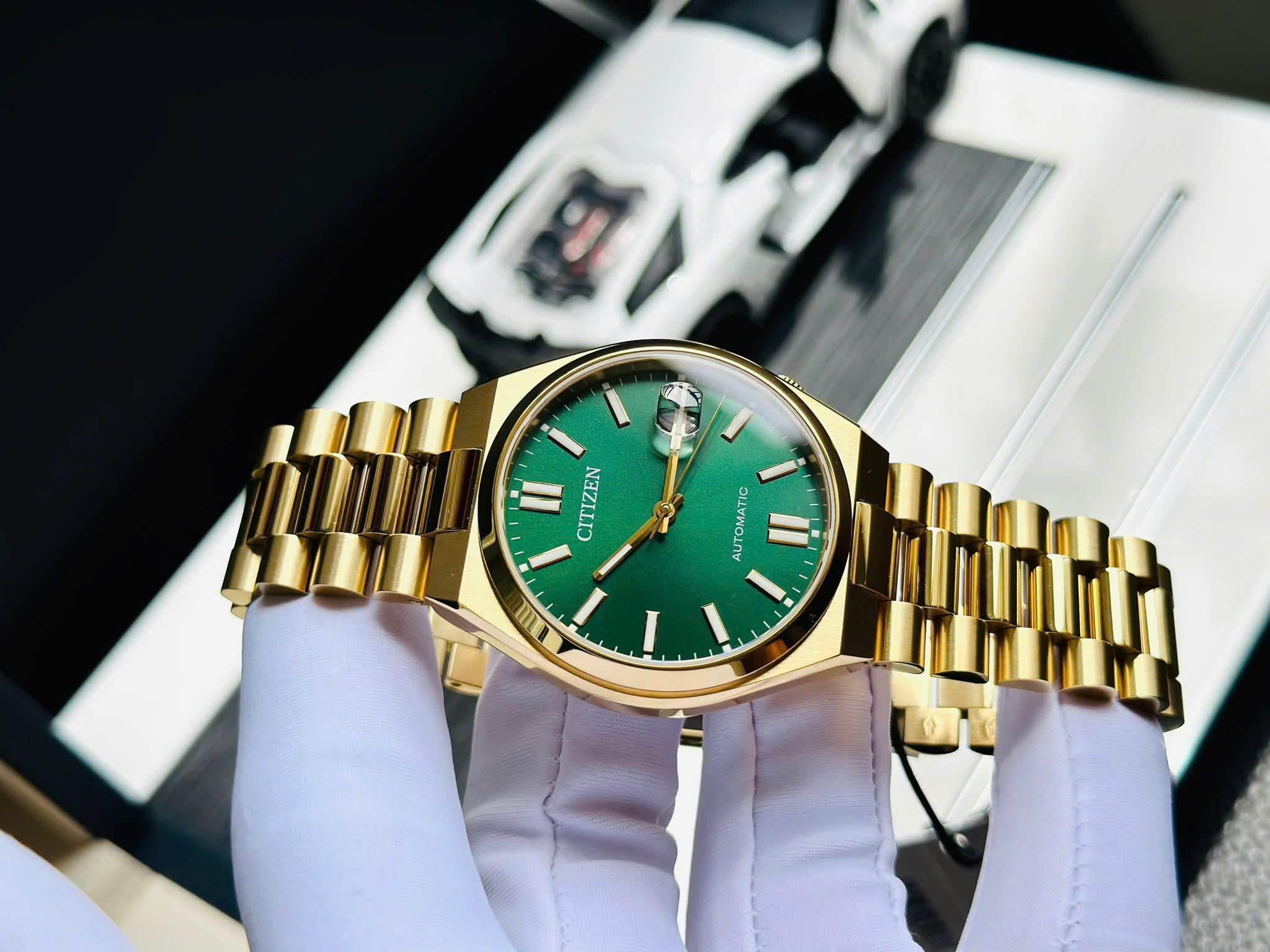 Đồng hồ Citizen Tsuyosa NJ0152-51X President - Dây Thép Full Vàng Gold & Mặt số Xanh Lá Sapphire là sự kết hợp tinh tế giữa vẻ đẹp cổ điển của đồng hồ cơ và phong cách hiện đại, lịch lãm cho các quý ông đam mê đồng hồ thời trang nam!