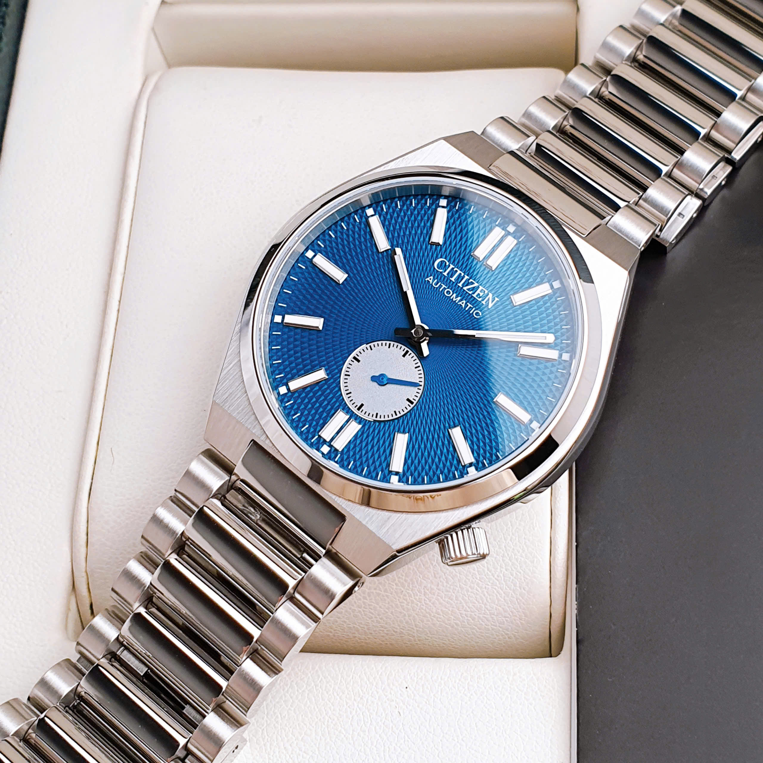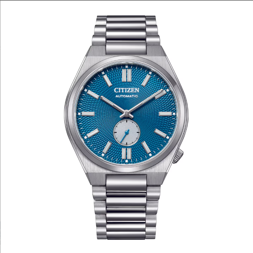 Đồng hồ Citizen Tsuyosa Small Second NK5010-51L - Mặt số Guilloche Xanh Dương trẻ trung kết hợp thiết kế kim giây rốn cổ điển là sự kết hợp tinh tế giữa vẻ đẹp cổ điển của đồng hồ cơ và phong cách hiện đại, lịch lãm.