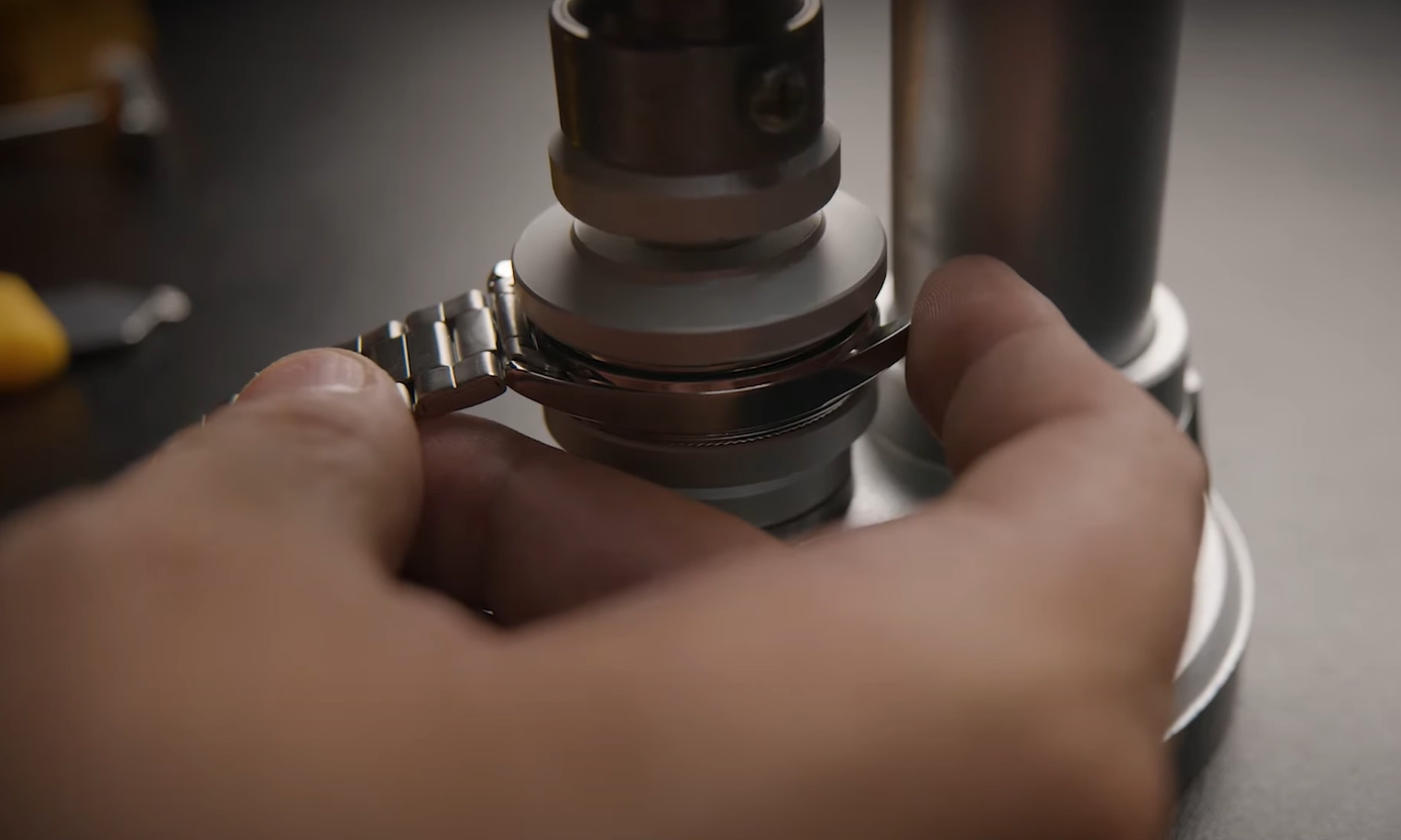 Đóng lại: Sử dụng máy ép chuyên dụng để ép nắp vào lại với đồng hồ (Lưu ý: Xác định mặt kính đồng hồ là mặt phẳng hay mặt bo tròn để dùng miếng lót phù hợp, tránh tác động lên kính mặt số đồng hồ.